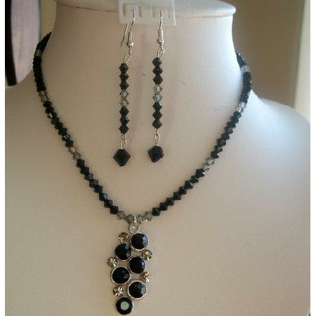 Sleek & Dainty Jet Crystals & Black diamond Crystals 4mm facted grapes Pendant Set. We used all genuine materila like jet Crystals. The design is handmade dozens of lustrous sparkling Authentic Crystals. What a great way to accentuate your dress neckline this Set is divenely feminine. Necklace length measures 16 inches & have Lobster claw clasp which is adjustable & extendable upto 3 inches The Authentic Sterling 92.5 Silver stamped Earrings measures 2 1/2 inches